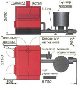 В состав котла входит: котёл, бункер топлива, механизм подачи с автоматикой управления температуры, мультициклон очистки дымовых газов, шит управления .
