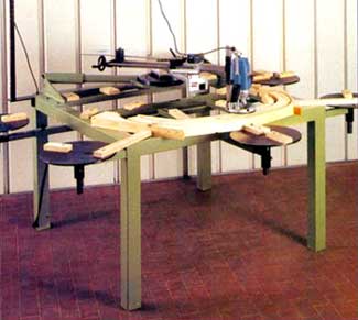 Склеенную на минишип многоугольную заготовку, закрепляют на столе. По телескопической линейке выставляют необходимый радиус фрезерования. Ручным фрезером выпиливается необходимая арка, так же можно выбирать штапик (раскладку) для окон и дверей.
