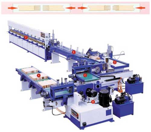 Автоматический двухпозиционный пресс для сращивания по длине, обозначен на схеме (F), производит автоматический набор заготовок одновременно с прессованием. Пресс оснащен столом с двумя рабочими зонами, гидравлической системой опрессовки плети и бесступенчатой регулировкой скорости подачи.