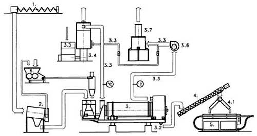 Технологическая линия для обработки опилок лесопиления посредством брикетирования с производительностью 200, 400, 600 или 800 кг брикетов в час. Линия состоит из подгребающего шнека для забора сырья из свободно насыпанной массы, системы ленточных и шнековых конвейеров для транспортировки опилок, сортировочного устройства, барабанной сушилки, включая котел для ее отопления, и одного (400 кг/час) или двух брикетных прессов.