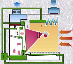 С помощью вентилятора, установленного на крыше камеры, создается разряжение, которое обеспечивает всасывание воздуха, с помощью водяной завесы (поз.1) происходит осаждение твердых пигментов краски. Промывка водой и дополнительная сухая фильтрация (D) позволяют улавливать аэрозоли и осаждать их в сборной ванне. Насос (поз.2) обеспечивает циркуляцию воды по ваннам (А, В, С), перелив из которых образует водяные завесы. B некоторых версиях имеются еще две дополнительные боковые завесы для оптимизации первой стадии фильтрации.