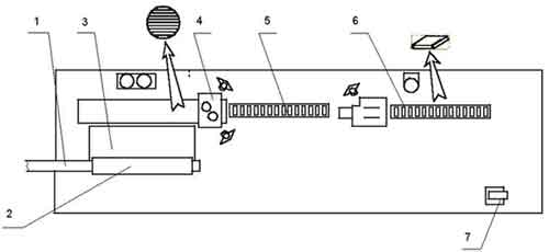 Бревна, по бревнотаске поз.1 подаются в цех. Бревна диаметром от 100 до 300 мм с одностороннего сбрасывателя поз.2 подаются на устройство поштучной выдаче поз.3 откуда подаются на двухдисковый горизонтальный станок СКД-1 поз.4, горизонтальный круглопильный двухдисковый станок. Предназначен для распиловки бревен на необрезную или обрезную доску, брус или двухкатный брус. Станок обеспечивает высокое качество поверхности изделий, точную геометрию, высокую производительность. Скорость подачи регулируется плавно оператором при помощи частотного преобразователя фирмы DANFOSS. Необрезные доски либо брус поступают по рольгангу поз.5 к кромкообрезному станку СОД-1М поз.6, Станок предназначен для продольной распиловки необрезных досок и двухкантных брусьев на обрезные пиломатериалы.