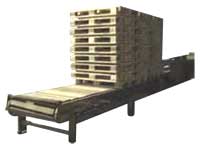 2. Транспортер представляет собой постоянно двигающийся непрерывный шаблон для первого станка. Двое работников по разные стороны транспортера устанавливают в его ячейки проставочные блоки и поперечные лаги. Еще двое работников накрывают их широкими и узкими настильными досками. Каждый укладывает только свои заготовки. Таким образом четыре человека согласованно, не мешая друг другу, обеспечивают непрерывную подачу укладок для сколачивания на первом станке.
