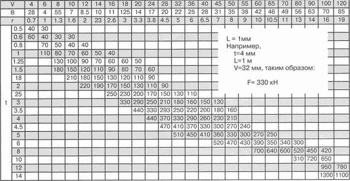 ТАБЛИЦА ДАВЛЕНИЯ ДЛЯ СГИБАНИЯ МЕТАЛЛИЧЕСКИХ ЛИСТОВ