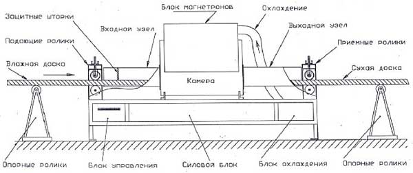Основа любого деревообрабатывающего производства - высококачественный пиломатериал. Одной из самых сложных, длительных и дорогостоящих процедур в подготовке материала является сушка сырого леса. Традиционные технологии сушки древесины предусматривают нагрев ее горячим воздухом, топочными газами или перегретым паром. При этом тепло, необходимое для испарения влаги из древесины подводится от горячих газов к поверхности пиломатериала. После испарения влаги с поверхности тепло к внутренним влажным слоям подводится через слой высушенного материала, теплопроводность которого очень низкая. Температура сушильного агента может достигать 250 градусов, поэтому наружные слои сильно перегреваются. Это приводит к стягиванию капилляров древесины. В зоне соприкосновения сухих и еще влажных слоев возникают напряжения которые приводят к растрескиванию материала или его геометрической деформации. Встречные потоки тепла и влаги в слое древесины не позволяют достичь высоких скоростей сушки. В результате процесс сушки растягивается на 2-3 недели. Кроме того отходящие газы имеют высокую температуру, поэтому тепловой к. п. д. таких сушилок очень низкий и затраты тепла составляют до 10000 кДж/кг влаги (до 2500 ккал/кг).