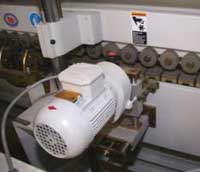 Привод подачи осуществляется с помощью мотор-редуктора. Скорость подачи транспортера регулируется бесступенчато с пульта управления в зависимости от материала и типа используемого клея. Обеспечивается надежное и высококачественное приклеивание облицовочного материала на профильные кромки.