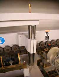 Верхние прижимные ролики имеют возможность настройки по высоте в зависимости от толщины обрабатываемых заготовок. Настройка обеспечивается перемещением верхней балки с помощью винтовых пар по мощным цилиндрическим направляющим. Фиксация положения балки производится цанговыми зажимами. Отсчет размера осуществляется по линейке. |