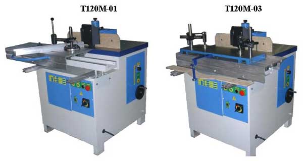 Предназначены для выполнения разнообразных фрезерных работ по дереву по направляющим линейкам с ручной подачей заготовки (изготовление вагонки, половой доски, плинтуса, наличника, филенки и других погонажных изделий), зарезки простых шипов с помощью шипорезной каретки и криволинейного фрезерования по копиру (мод.Т120М-03) с ручной подачей.