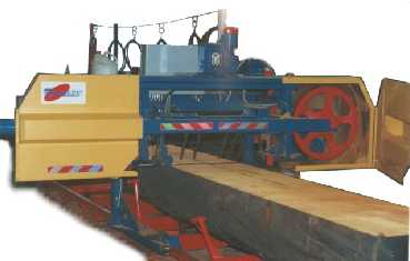 Распиловка производится ленточной пилой, вращающейся через два шкива. Бревно базируется на рельсовом пути станка по упорам и прижимается винтовыми прижимами. Установка толщины распиливаемого материала осуществляется с пульта оператора при помощи электродвигателей.