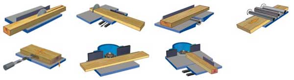 Продольная, поперечная, под наклоном и под углом распиловка дисковой пилой массива;