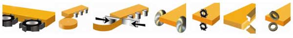 Выполняет снятие свесов по верхней и нижней стороне панели, а также обеспечивает автоматическое закругление углов приклеенного кромочного материала без остановки обрабатываемого элемента. Можно производить снятие верхнего и нижнего свесов или закругление углов, используя либо тонкий кромочный материал, либо PVC/ABS толщиной до 3 мм. Все четыре угла торца заготовки обрабатываются за один проход, без ручного вмешательства.