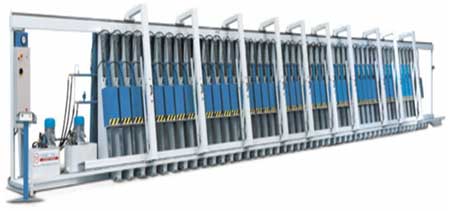 Оператор набирает пакет из заготовок с предварительно нанесенным клеем для производства бруса или щита. Далее устанавливает фронтальные прижимы, равномерно распределив их по плоскости прессуемого изделия на каждой рабочей зоне. Процесс прессования начинается после включения оператором последовательно сначала фронтальных прижимов, затем вертикальных гидроцилиндров работающих от установленного на пресс гидронасоса, обеспечивая тем самым равномерное распределение нагрузки на наши заготовки.