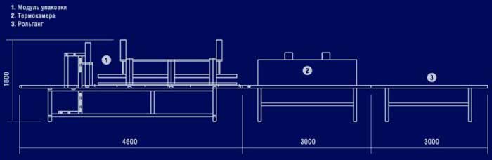 Оборудование предназначено для упаковки в термоусадочную пленку дверей, мебельных щитов, оконных блоков и т.п. Оператор кладет продукцию на подающий рольганг и вручную продвигает ее на модуль упаковки, где в полуавтоматическом режиме происходит продольная и поперечная запайка пленки. Далее оператор вручную подает продукцию на транспортер термокамеры, в которой происходит усадка пленки. Из термокамеры упакованная продукция выходит на рольганг и охлаждается.