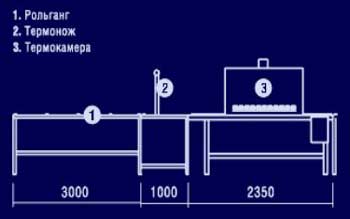 Комплект оборудования состоит из: стола-рольганга для упаковки, роликов под размотку бобины с термопленкой, термокамеры и термоножниц.