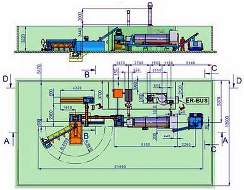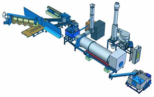 Технологическая линия для обработки опилок лесопиления посредством брикетирования с производительностью 200, 400, 600 или 800 кг брикетов в час. Линия состоит из подгребающего шнека для забора сырья из свободно насыпанной массы, системы ленточных и шнековых конвейеров для транспортировки опилок, сортировочного устройства, барабанной сушилки, включая котел для ее отопления, и одного (400 кг/час) или двух брикетных прессов.