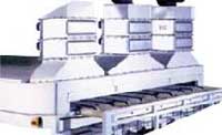 Предназначен для тепловой сушки водорастворимых, акриловых, полиуретановых и прочих традиционных грунтов и лаков за короткий период времени. Поперечное расположение туннеля позволяет увеличить время нахождения окрашенного погонажа в зоне сушки по сравнению с линейными проходными туннелями. Неоспоримым преимуществом данной модели является сушка заготовок до возможности последующей обработки, шлифования или складирования; это во много раз увеличивает производительность, сокращает требуемую площадь, экономит рабочее время и дает высокое качество отделки. Погонаж и багетные заготовки приходят к туннелю непосредственно со станка для проходной спрейной окраски, и далее с помощью цепной поперечной подачи загружаются в туннель. Нагретый и тщательно очищенный воздух равномерно по всей ширине туннеля подается по встречному направлению к движению заготовок.