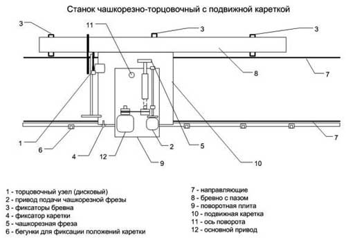 Чашки вырезаются двухножевыми фрезами при движении фрезерного узла. Фрезерный узел установлен на каретке, которая может перемещаться по направляющим. Разметка положения чашек на бревне осуществляется при помощи системы фиксаторов, которые обеспечивают жесткую и точную фиксацию точки выборки чашки. По желанию заказчика станок может быть оснащен дисковым или цепным пильным узлом для торцовки бревен.