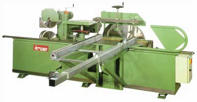 Основная комплектация станка несет в себе 3 основных пильных узла. Два узла имеют стандартное вертикальное расположение пил, а один горизонтальное. Тем не менее, вертикальные пилы имеют возможность осуществлять раскрой и фрезеровку под углом отличным от 90 град. Каждый из узлов имеет удобную систему настройки под необходимый угол раскроя. Горизонтальный пильный узел может быть дополнительно оснащен фрезерными гарнитурами под фрезеровку "минишипа" или торцевую выборку. Станок комплектуется подвижной +/- 60 град поворотной шипорезной кареткой.