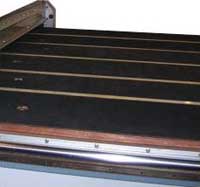 Жесткий рабочий стол с поверхностью из синтетического износостойкого материала. Имеются отверстия для подачи воздуха от четырех вентиляторов отдельно на каждую секцию с целью создания воздушной подушки между поверхностью стола и листом стекла. Обеспечивается легкое перемещение стекла большого размера по рабочей поверхности для базирования и последующей обработки. |