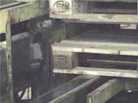 5. Транспортер второго гвоздезабивного станка представляет собой цепь разделителей для шаблонной установки заготовки. Здесь всего один человек раскладывает на перевернутую заготовку нижние продольные лаги