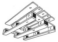 2. Транспортер представляет собой постоянно двигающийся непрерывный шаблон для первого станка. Двое работников по разные стороны транспортера устанавливают в его ячейки проставочные блоки и поперечные лаги. Еще двое работников накрывают их широкими и узкими настильными досками. Каждый укладывает только свои заготовки. Таким образом четыре человека согласованно, не мешая друг другу, обеспечивают непрерывную подачу укладок для сколачивания на первом станке.