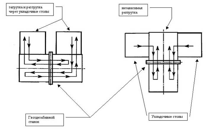 либо через укладочные столы (при U – компоновке), либо непосредственно с загрузочно-разгрузочного