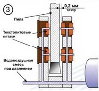 Водовоздушная смесь под давлением Водовоздушная смесь, подающаяся под давлением через форсунки, смачивает и охлаждает пилу и выполняет функцию подшипников.
